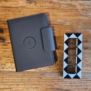 Mag-Wireless Charger, power bank, USB drive & notebook.
