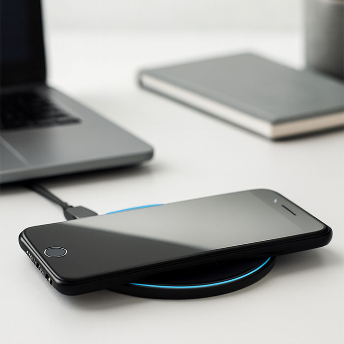 Power up your devices with this sleek 10W aluminum wireless charger. Featuring a premium glass top, it effortlessly charges your smartphone when placed on its surface. Simply connect the charger to your computer, lay your device on it, and watch the blue light illuminate to indicate charging. With an output of DC 9V/1.1A, it’s compatible with the latest android models and iPhones® from the 8 and X onward. Experience fast, efficient charging with this stylish, modern accessory.