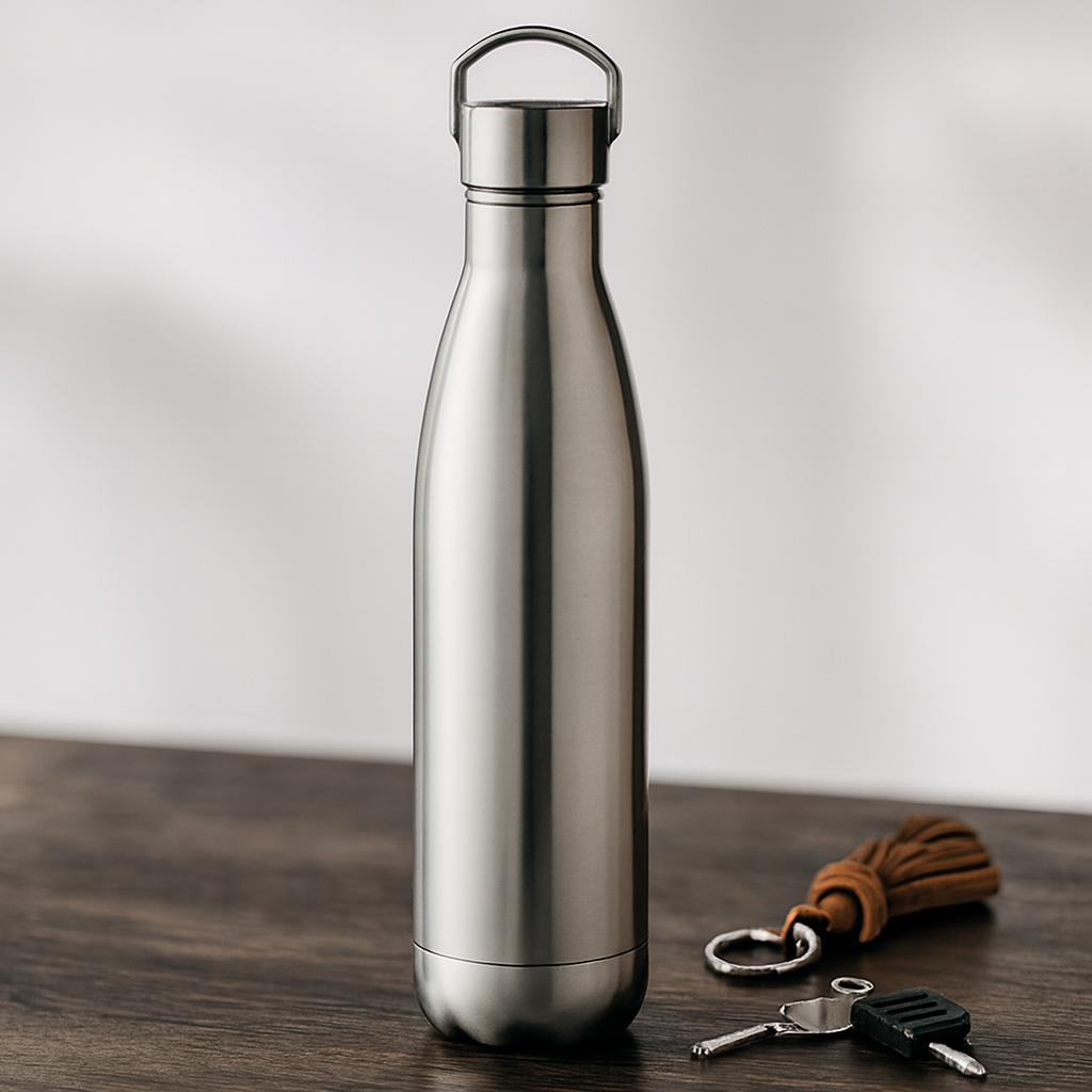 Airelles, an insulated vacuum bottle crafted with a double-wall construction using a blend of 90% recycled stainless steel and 10% new stainless steel. Designed to be leak-free, it features a convenient handle lid for easy carrying. With a capacity of 500 ml, this eco-friendly bottle ensures your beverages stay at the perfect temperature for longer, making it an ideal choice for sustainability-conscious consumers.