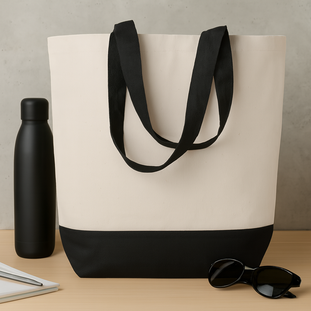 Canvas 280gr/m² shopping beach bag with coloured bottom detail and matching handles (inside pocket).