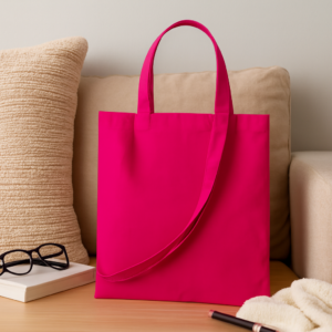 Sustainable jute bags with long handles. Covered with cotton on the front and matching handles. Wooden buttons closure and front pocket.