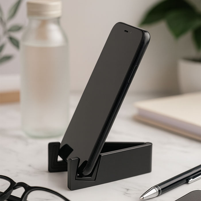 Foldable smartphone holder made of 50% bamboo fibre and 50% PP.
