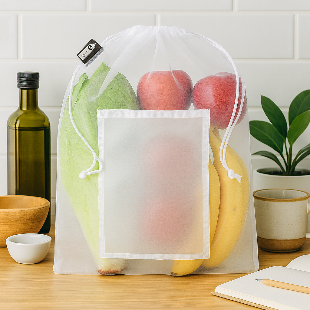 Food bag in mesh RPET with front pocket and white PP drawstring cord on top.