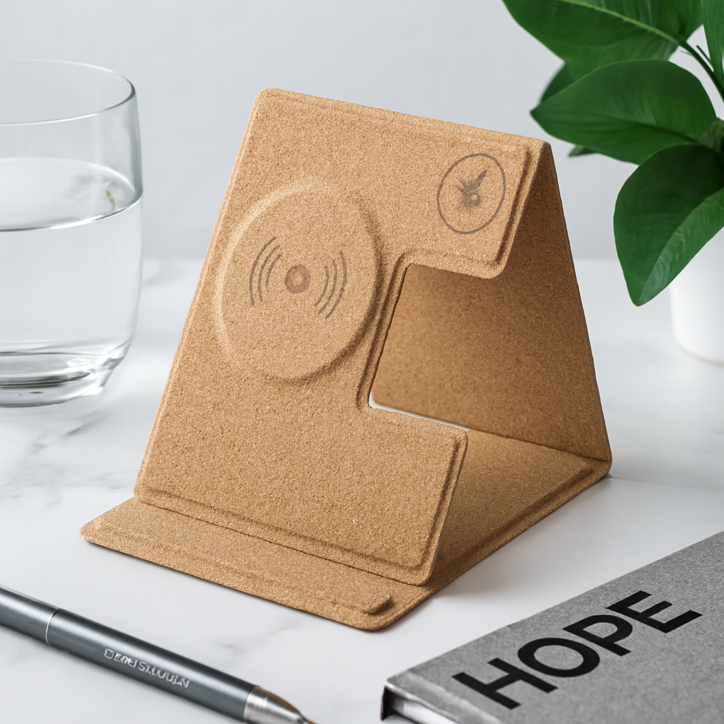 Corizza is the essence of wireless charging convenience and sustainability. Crafted from eco-friendly cork material, this charging station combines cutting-edge 15W magnetic wireless charging capabilities for your mobile phone, magnetic Apple Watch, and wireless-charging-enabled earpods (up to 3W). With just one Type-C connection, you can simultaneously power up all your essential devices. The foldable design makes it highly portable and an ideal gift for any corporate event.