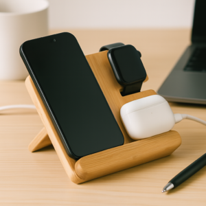 Power up sustainably with this sleek 3-in-1 wireless charging station designed for your phone, earbuds, and Apple Watch. Made from recycled aluminium, its removable L-stand offers versatility and easy transport. Whether upright on your desk or packed flat in your bag, it keeps your devices charged and organized in style. Compact, portable, and eco-conscious, the perfect companion for life on the go. Charge smart, live sustainably.