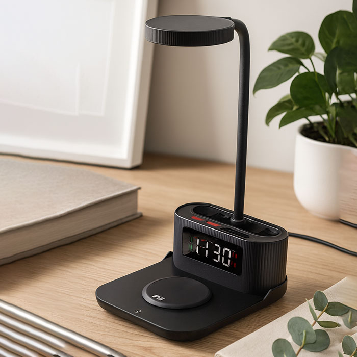 Versatile desk lamp combines functionality and modern design. Equipped with a 15W wireless charger, it ensures your devices stay powered while you work. The built-in clock helps you keep track of time, and the integrated pen holder keeps your workspace organized. With adjustable brightness settings, this lamp is perfect for reading, studying, or working late into the night. Enhance your desk setup with this all-in-one solution that blends style, convenience, and efficiency.