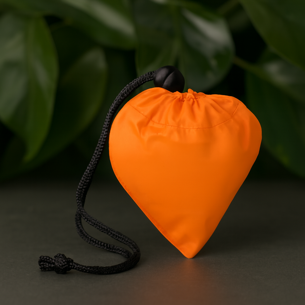 Foldable shopping bag in 210D polyester with drawstring closure on pouch.