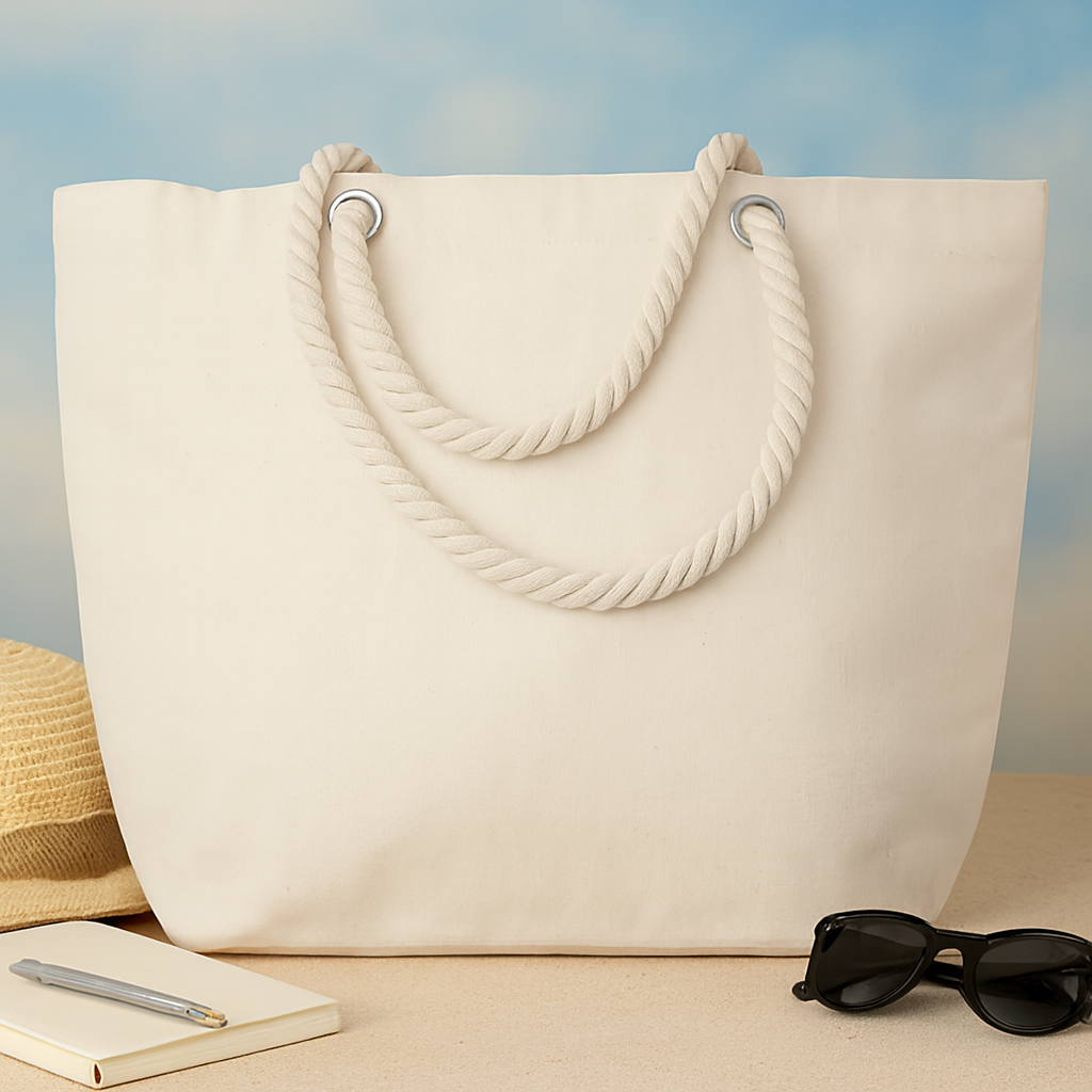 Beach bag or shopping bag in cotton with cord handle. 220 gr/m².