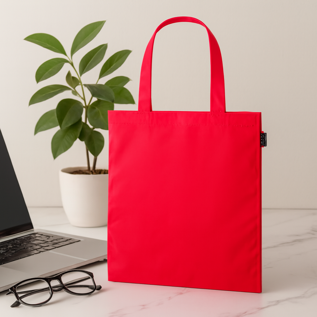 Shopping bag in 190T RPET with long handles. 100 gr/m². Eco-friendly material made from recycled plastic bottles.