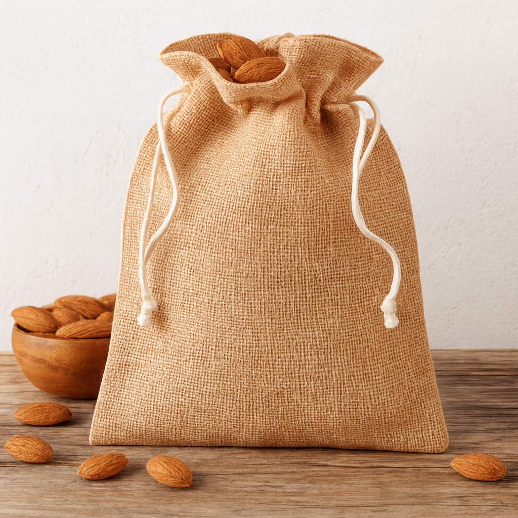 Small gift jute draw cord bag. Size approx.