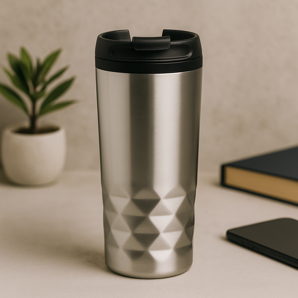 Double wall stainless steel travel cup with inner PP and lid. Capacity: 280 ml.