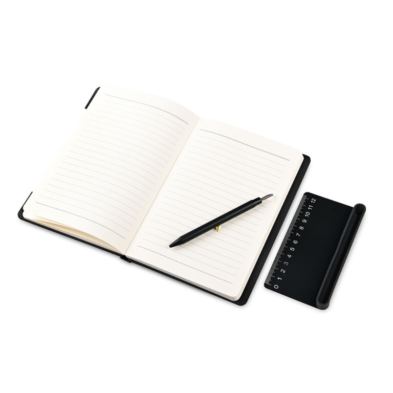 Eco-friendly A5 notebook combines style and functionality, crafted from durable recycled PU material. Featuring 96 high-quality sheets, it’s perfect for notes, sketches, or journaling. Thoughtfully designed with a built-in phone stand, it allows hands-free viewing while working, and a convenient ruler ensures precise measurements on the go. Compact and versatile, it’s ideal for students, professionals, or anyone who appreciates organized creativity. Sustainable, practical, and elegantly designed for everyday use.