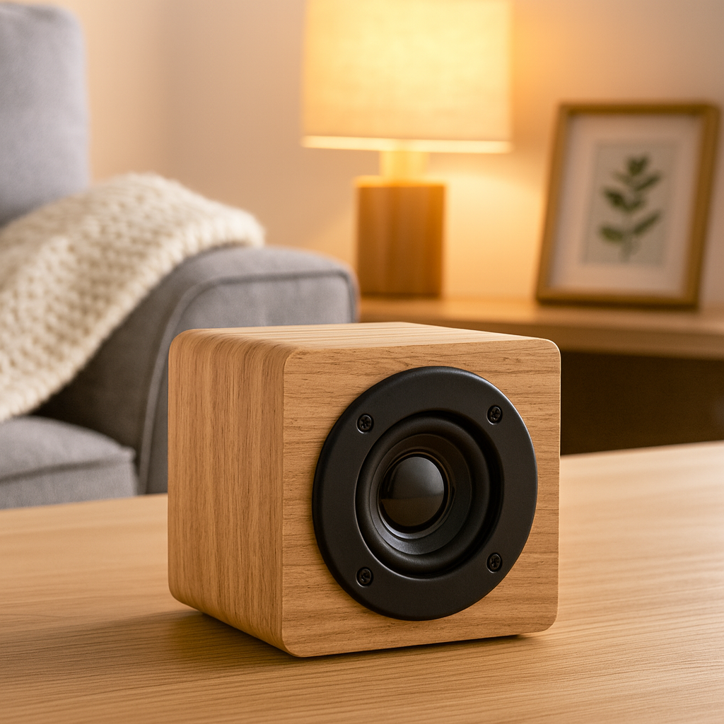 Eco-friendly bamboo wireless speaker, version 5.1 with 3W output and built-in amplifier. Rechargeable 350 mAh lithium-ion battery. Includes USB charging cable. Playing time approx. 2 hours.