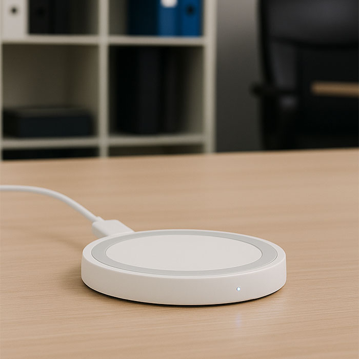 A small and compact fast wireless charger with 10W output. Ideal to have on your office desk or your bed nightstand to always have a charged phone with you. Compatible with all QI enabled devices such as latest Androids, iPhone® 8 and newer. A blue LED light will indicate when it’s charging.
