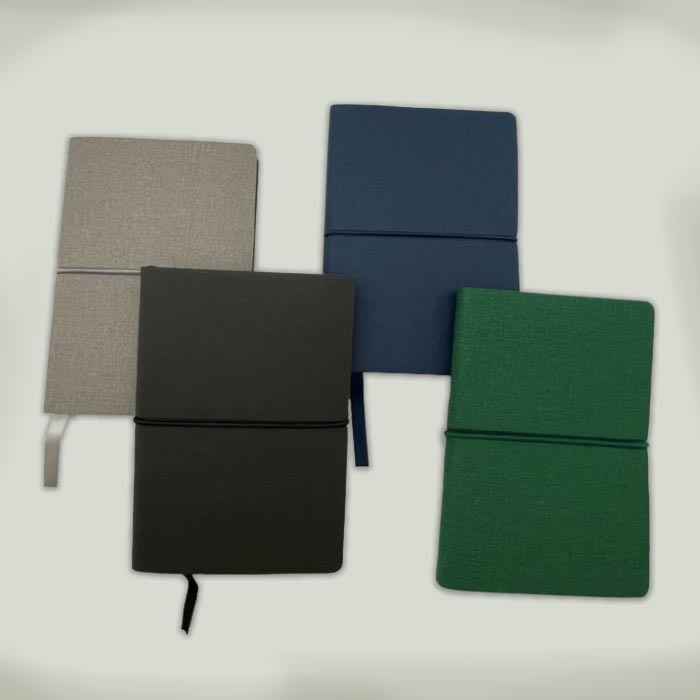 Fine grain fabric finish PU leather notebooks with a soft cover, closed with an elegant elastic. Contains yellow sticky post-it-notes for reminders. Available in 4 attractive colours.