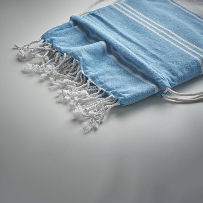Hammam beach towel set includes a stylish drawstring bag for convenient storage and transport. Made from 70% recycled cotton and 30% recycled polyester, the towel offers eco-conscious comfort with a soft and absorbent 180 g/m² fabric. Measuring 90×160 cm, it’s generously sized for beach, spa, or poolside relaxation. Lightweight and quick drying, it’s perfect for travel and everyday use. A practical and sustainable gift or personal essential that blends functionality with thoughtful design.