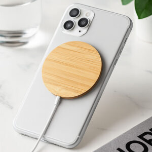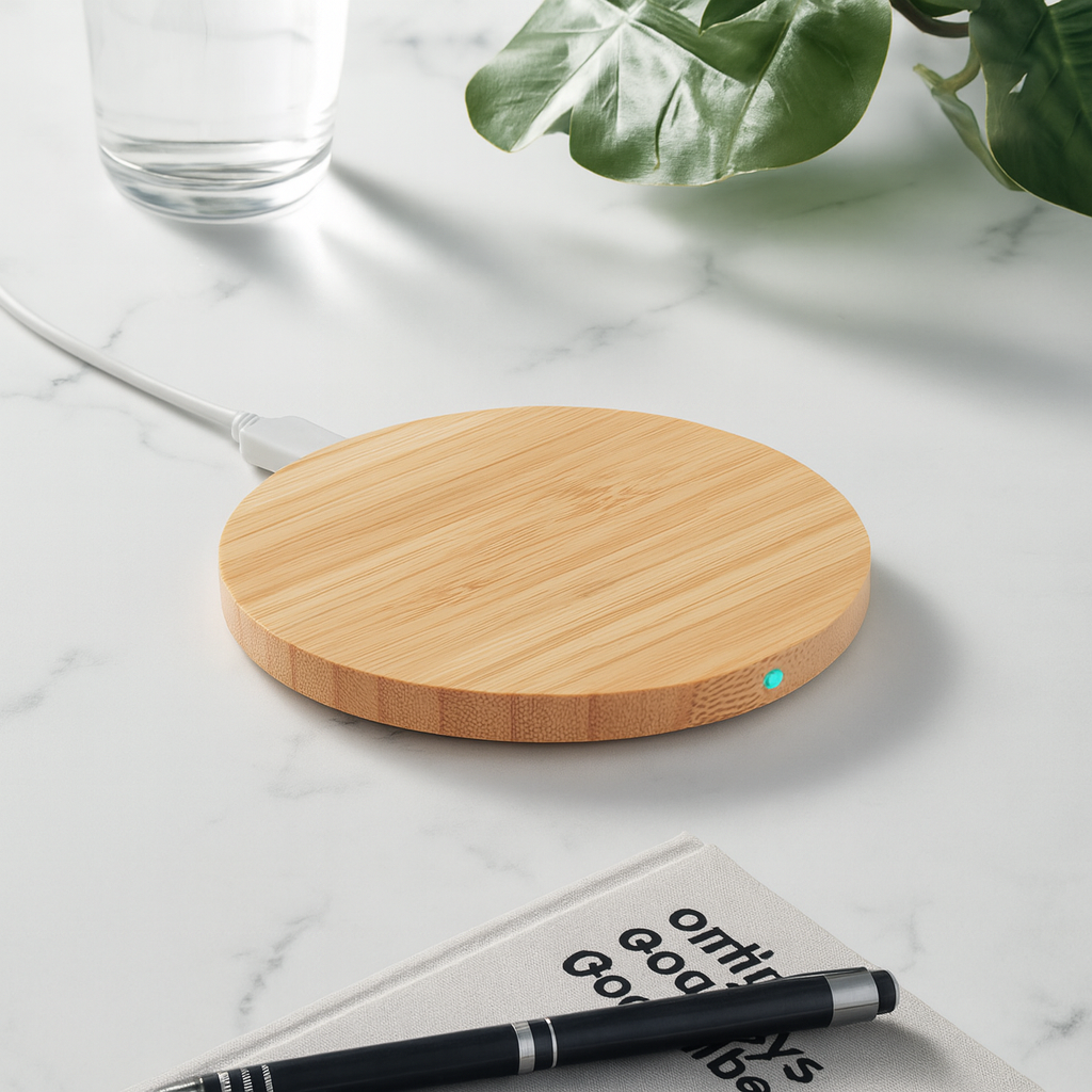 Environment-friendly bamboo wireless quick charger with 15W charging speed. Blue light charging indicator. Output: DC 9V/1.67A (15W). Compatible with all QI-enabled devices such as the latest Androids, iPhone® 8, X, and newer.