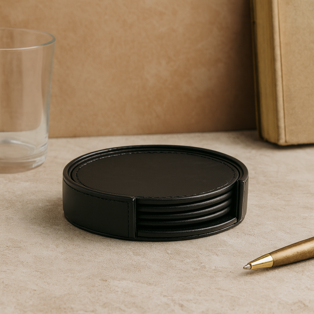 For those seeking high brand visibility while gifting, these desktop coasters are an ideal selection. Elevating ones dining experience this elegant set of four coasters is crafted from durable PU material for a sleek and modern look. Each coaster is designed to protect surfaces from spills, stains, and heat marks, while maintaining a stylish appeal. The set comes neatly organized in a matching PU holder, making it easy to store and access when needed. Perfect for office, home, or as a thoughtful gift, these coasters combine functionality and sophistication seamlessly.