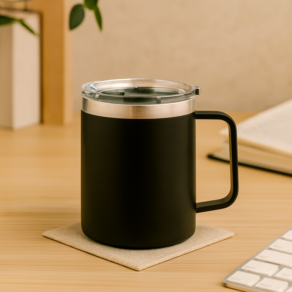 Double wall recycled stainless steel (90% recycled stainless and 10% stainless steel) mug with sliding sip hole cover. Leak-free. Capacity: 300 ml.