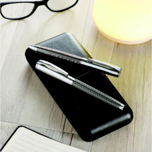 Sleek roller pen crafted for professionals who value both style and precision. With a smooth 0.7mm blue ink refill, it ensures effortless writing for everyday use or signing important documents. Designed with a matte black aluminium barrel, complemented by brass and iron details, it exudes understated elegance. Resting in a matching matte black stainless-steel base, it combines practicality with sophistication. Presented in premium gift packaging, it makes an ideal choice for offices, executives, and corporate gifting.