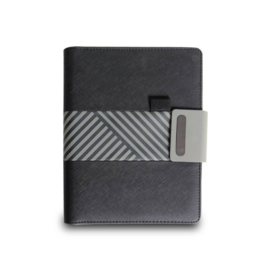 Introducing the Improved Trendy Organizer, featuring an A5 notebook encased in premium PU material. This organizer boasts a distinctive signature design at its centre, doubling as a business card holder, complemented by an elastic pen loop above. The magnet closure, enhanced with an elongated metal plate, offers a sleek branding opportunity. Inside, you’ll find a versatile mobile stand, an additional elastic pen loop, and multiple holders for business cards. Two elastic bands are included to secure accessories and cables. The notebook contains 56 sheets of cream-lined paper and 8 sheets of blank paper, providing ample space for all your note-taking needs.