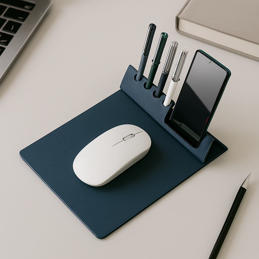 Mouse pad is crafted from a unique PU material, specially designed to enhance durability and comfort during use. It includes a versatile desktop organizer capable of accommodating up to four pens, along with a convenient slot for storing business cards, which doubles as a stand for your phone. This multifunctional design not only ensures a smooth and precise mouse surface but also helps keep your workspace tidy and organized. Perfect for both professional and personal use, it combines practicality with sleek, modern aesthetics to elevate your desktop experience.