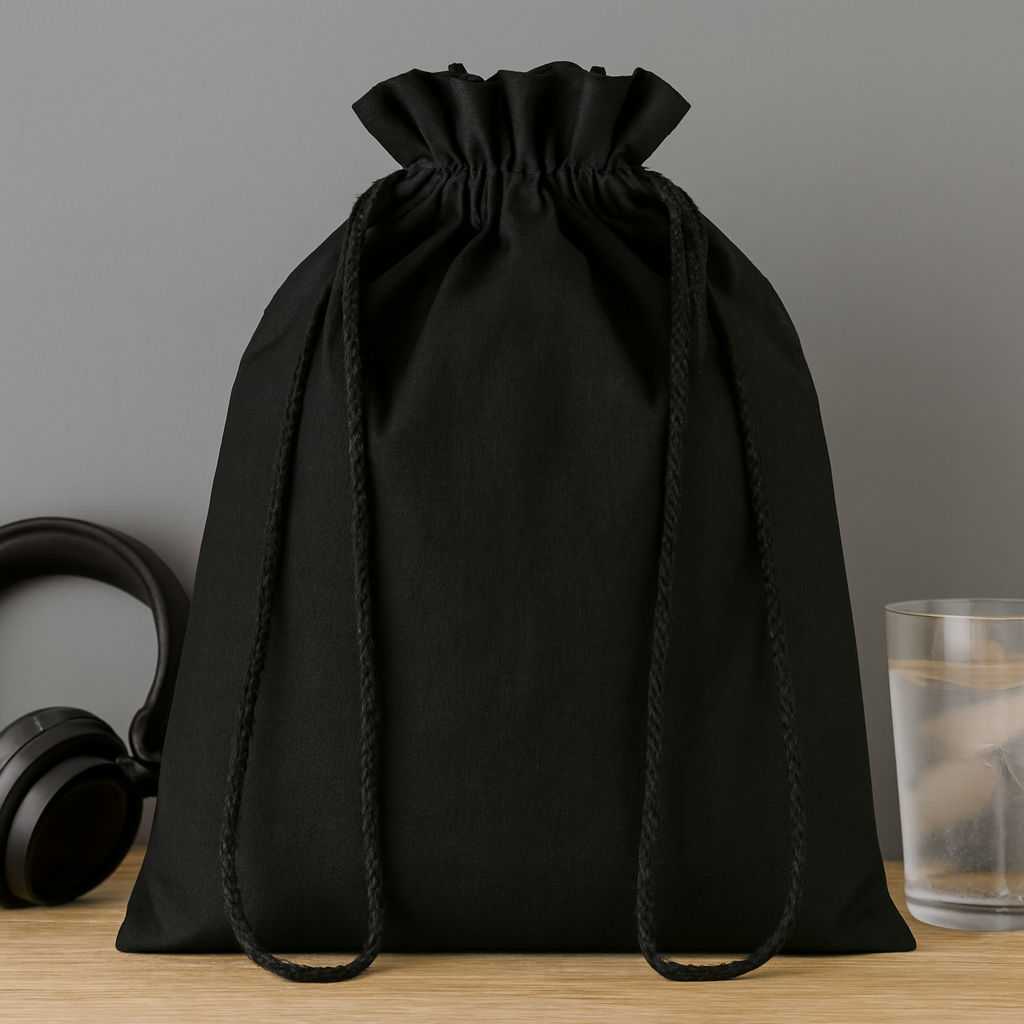 Medium gift cotton draw cord bag. Size approx. 25 x 32cm. 105 gr/m². Produced under a certified standard for the use of harmful substances in textile.