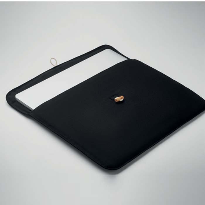This laptop pouch is designed for 15-inch devices and crafted from durable 220 gr/m² cotton, offering robust protection. The interior features a soft 120 gr/m² lining to cushion your laptop, preventing scratches and minor impacts. For an eco-friendly touch, the pouch is secured with a stylish bamboo button closure, adding a natural aesthetic. The combination of sturdy cotton fabric and a gentle inner lining ensures both durability and comfort for your laptop. Perfect for everyday use, this padded laptop pouch blends functionality with sustainability, making it an ideal choice for environmentally conscious individuals.