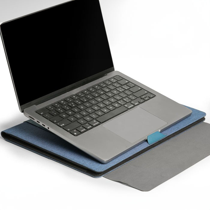 Versatile 2-in-1 laptop sleeve and workstation combines modern design with sustainable innovation. Crafted from GRS-certified RPET and stylish leather accents, it easily transforms into a mobile office with a built-in laptop stand for convenient work anywhere. Multiple sleeve pockets and pen loops keep essentials organized, while each recycled piece saves water, reuses plastic bottles, and supports Water.org—helping provide safe water and sanitation to communities in need. A practical, eco-conscious gift that gives back.