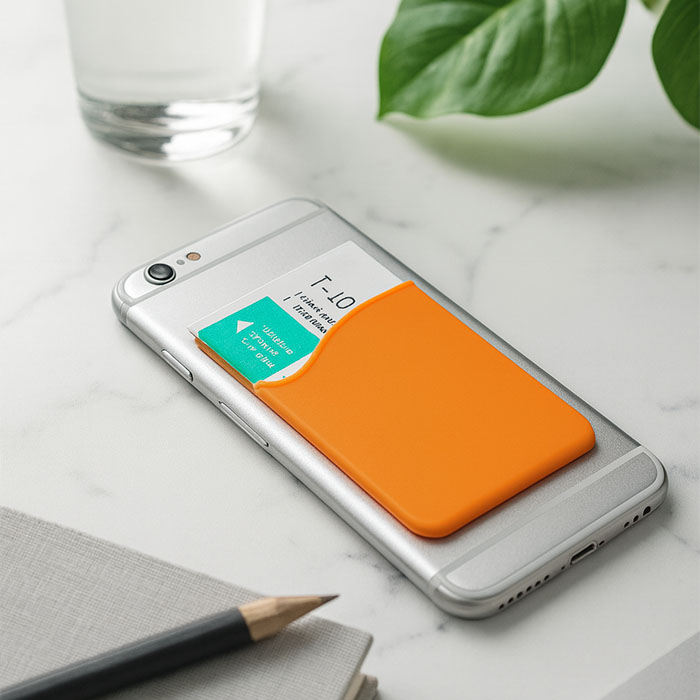 Simple silicone card holder with tape to attach it to the back of the smartphone.