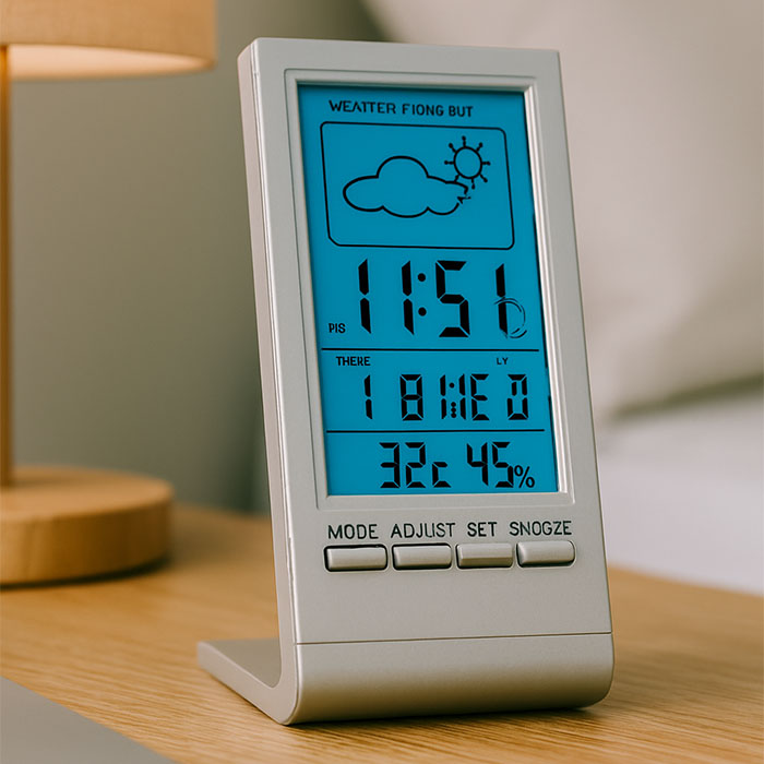 Weather station with blue LCD display. Displays weather forecast, time, date, temperature and humidity. Alarm function. 1 cell battery included.