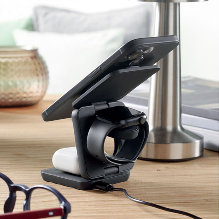 Charge smarter with this 3-in-1 foldable charging station, crafted from rubberized recycled ABS for a sleek, eco-conscious finish. It features a 15W magnetic wireless charger, a dedicated Apple® smartwatch charger, and a TWS earbud charging pad—all in one compact, foldable design. Ideal for desks, travel, or nightstands, it keeps your essentials powered and organized. A sustainable and space-saving solution for modern tech users who value performance, versatility, and environmental responsibility.
